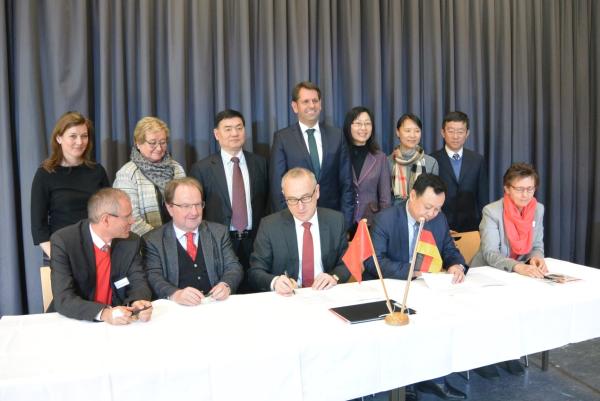 雅德大學(xué)校長在致辭中對中方代表團(tuán)的到來表示歡迎,對已開展的合作表示滿意,并對未來的合作寄予希望。下薩克森州經(jīng)濟(jì)部長致辭中表示,在教育的合作基礎(chǔ)上,期望未來能與中國進(jìn)行更多經(jīng)濟(jì)和文化的合作與交流。威廉港市市長首先祝賀合肥學(xué)院和雅德大學(xué)友好合作25周年,并期望在未來雙方能互派出更多的留學(xué)生。中國駐漢堡總領(lǐng)事館副總領(lǐng)事王薇在講話中表示今年是中德建交45周年,中德兩國在各個(gè)領(lǐng)域都有緊密合作。十九大繪制了中國未來的發(fā)展藍(lán)圖,一帶一路為中國的合作開拓新局面。中德兩國都確定維護(hù)世界和平,促進(jìn)共同發(fā)展至關(guān)重要。合肥學(xué)院就是中德聯(lián)合辦學(xué)和兩國文化交流很好的例子。合肥學(xué)院黨委書記蔡敬民表示,合肥學(xué)院在與雅德大學(xué)合作過程中取得了很多成績,為兩國培養(yǎng)了優(yōu)秀的人才,合肥學(xué)院非常重視與雅德大學(xué)的合作,并希望在今后的25年取得更輝煌的成就。在周年慶典上,蔡敬民書記和雅德大學(xué)校長簽署了新的合作協(xié)議,并為合肥學(xué)院德國校友會(huì)進(jìn)行了揭牌儀式。