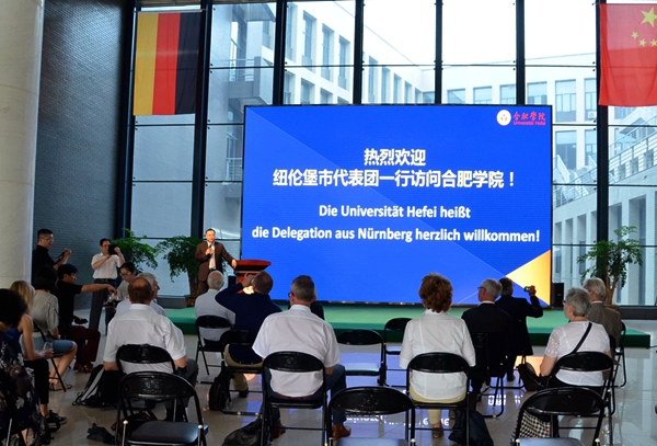 蔡敬民對紐倫堡市代表團一行來訪表示歡迎,并從合肥學院基本情況、中德共建新型大學建設的改革成果、中國安徽—德國中心的發展情況等方面作了介紹。他談到,合肥學院是一所在改革中誕生,開放中成長,創新中發展的學校,被譽為中國高等教育改革的 “小崗村”。他指出,我校根據自身辦學定位,制定應用型人才培養方案,致力于打造能力導向的模塊化教學體系。在對德合作方面,合肥學院積極借鑒德國本科應用型人才培養體系的研究、創新與實踐,努力突破學科定勢,打造模塊化課程,重構能力導向的應用型人才培養教學體系,走出了一條符合合肥學院自身改革創新發展的特色之路。在談到中國安徽——德國中心,他表示,德國中心自啟動以來,堅持改革創新協同發展,積極開展對德合作交流,在對外打造安徽形象、促進中德友好交流合作等方面有重要意義。