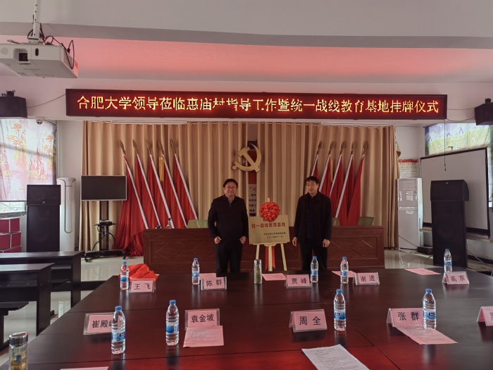 11月15日,合肥大學(xué)“統(tǒng)一戰(zhàn)線教育基地”在泗縣惠廟村舉行揭牌儀式,黨委委員、黨委宣傳統(tǒng)戰(zhàn)部部長(zhǎng)賈峰和惠廟村黨總支書記惠朋共同為基地揭牌。惠廟村山頭鎮(zhèn)黨委委員、宣傳部長(zhǎng)張群,合肥大學(xué)駐惠廟村第一書記周全及校統(tǒng)戰(zhàn)成員代表等參加儀式。