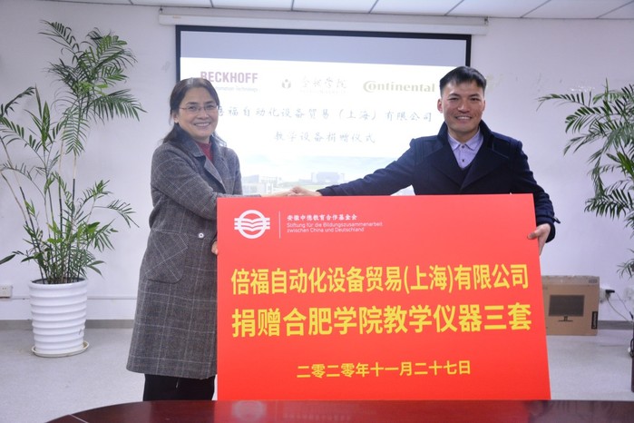 Am Nachmittag des 27. November fand die Spendenzeremonie für Lehrausrüstung der Beckhoff Automation Equipment Trading (Shanghai) Co., Ltd. im Besprechungsraum im Geb?ude 40 unserer Universit?t statt. Chen Xiu, Vizepr?sidentin der Universit?t Hefei und Vorsitzende des Stiftungsrats der Bildungskooperation zwischen China und Deutschland in Anhui (im Folgenden als Stiftung bezeichnet), nahm an der Spendenzeremonie teil. Zhang Hongbiao und Ge Changxiang, Vertreter von Beckhoff Automation Equipment Trading (Shanghai) Co., Ltd., Wang Xin, Vertreter der Continental Co., Ltd, He Shikun, Direktor der Finanzabteilung der Universit?t Hefei und Generalsekret?r der Stiftung, und Liu Jinping, Direktor des Verwaltungsbüros der Stiftung, nahmen an der Spendenzeremonie teil. Die Zeremonie wurde von Lv Gang, Direktor des Instituts für Manufaktur und Bauwesen, geleitet.