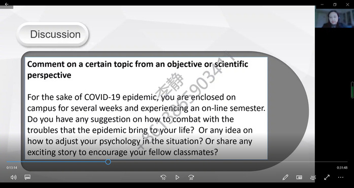 對于課程思政,外國語學院的李靜老師有著深刻的理解,“外語課程的思政教育是一個有深度有溫度的潛移默化的教育過程,應該結合課程特點和學生的認知特點,貫徹課程思政隱性滲透原則”。最近幾周,李老師發覺疫情讓不少學生產生了焦慮和煩躁心理,致使學習自律性下降。為緩解學生的焦躁情緒,讓更多學生在線上課堂“多抬頭”“多開口”,李老師在《高級英語》課的線上教學中組織了一次課堂討論:介紹一位你最敬佩的科學家。在討論中,大部分同學都提到了鐘南山和屠呦呦,李老師不僅擴充原有話題的內容與形式,還幫助同學了解防疫、抗疫的相關知識與政策。“這次討論活動不僅幫助學生尋找疫情中的正能量,培養科學觀和求真意識,還能激發學生樹立遠大理想,緩解焦躁情緒。”李老師說道。