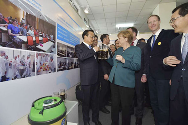 30日上午,李克強總理與德國總理默克爾在合肥學院食品專業交流合作展區共同品嘗我校學生釀制的德國黑啤。(中國新聞網 人民網消息)