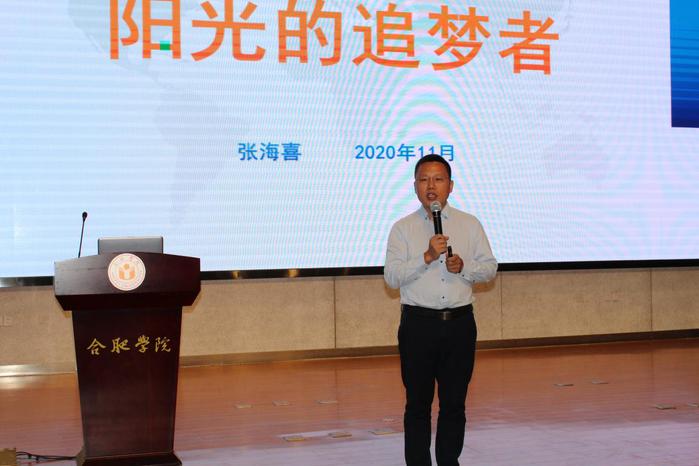 11月12日下午,由大學(xué)生創(chuàng)新創(chuàng)業(yè)教育中心、能源材料與化工學(xué)院和共青團(tuán)合肥學(xué)院委員會(huì)共同舉辦的“校慶校友第二期創(chuàng)業(yè)講座——陽光的追夢者”在圖書館報(bào)告廳A廳舉行,我校2009屆材化學(xué)院粉體專業(yè)畢業(yè)校友張海喜受邀分享創(chuàng)業(yè)歷程。能源材料與化工學(xué)院黨委書記童玉松、院長董強(qiáng)參加了創(chuàng)業(yè)講座,講座由大學(xué)生創(chuàng)新創(chuàng)業(yè)教育中心主任劉沛平主持。