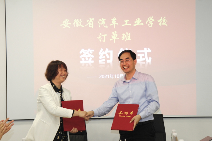 下午1點半,一行人乘車來到安徽風之星投資控股有限責任公司下屬的合肥寶利盛汽車銷售服務有限公司。首先,風之星集團人力資源總監葛學亮陪同大家參觀了店面,體驗了產品和服務。在展廳、維修車間、品牌文化區與工作人員就汽車銷售、汽車美容維修等方面與工作人員進行了交流,看望了在店內實習的職業院校學生,了解了畢業生在該公司的工作、生活情況。隨后,在公司會議室,安徽風之星公司人才發展經理陳晨等人介紹了公司的發展情況,重點從實習實訓基地建設、專業和課程建設、課題研究和團隊建設等方面匯報了校企合作情況。參會人員就人才培養和產業發展進行了交流。最后,在大家的見證下,風之星公司與安徽職業技術學院汽車工程學院舉行了現代學徒制合作簽約儀式,與安徽省汽車工業學校舉行了人才培養訂單班簽約儀式。