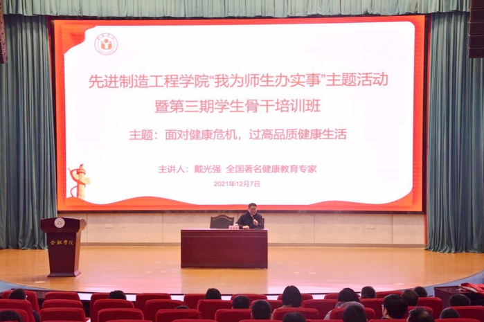 為結(jié)合黨史學(xué)習(xí)教育,深化“我為師生辦實(shí)事”主題活動開展,幫助師生養(yǎng)成良好健康的生活習(xí)慣,樹立正確生活理念,12月7日下午,我校先進(jìn)制造工程學(xué)院在圖書館報(bào)告廳舉辦“我為師生辦實(shí)事”主題活動,邀請全國著名健康教育專家戴光強(qiáng)教授來我校作健康知識專題講座,本次講座以“面對健康危機(jī),過高品質(zhì)健康生活”為主題,先進(jìn)制造工程學(xué)院全體教職工和學(xué)院學(xué)生骨干培訓(xùn)班全體學(xué)員聆聽講座。講座由先進(jìn)制造工程學(xué)院黨委書記杜娟主持。