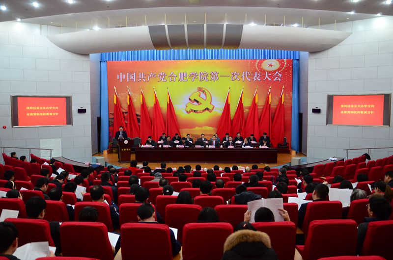 報告廳內氣氛莊嚴熱烈,大會主席臺上方懸掛著“中國共產黨合肥學院第一次代表大會”的會標,下方正中是金光閃閃的黨徽,鮮艷的紅旗分列兩側。本次大會的主題是:高舉中國特色社會主義偉大旗幟,以鄧小平理論和“三個代表”重要思想、科學發展觀為指導,全面貫徹黨的十八大和十八屆三中、四中全會精神,深入學習貫徹習近平總書記系列重要講話精神,堅持改革創新、開放辦學,主動適應地方經濟發展新常態,主動適應高等教育改革與發展的新趨勢,全面深化教育教學改革,全面推進依法治校,全面加強黨的建設,以人才培養為根本,以提高質量為核心,以改革創新為動力,解放思想、凝心聚力、攻堅克難,以更加開闊的視野、更加奮發的精神、更加務實的作風、更加執著的努力,加快推進地方應用型高水平大學建設進程。