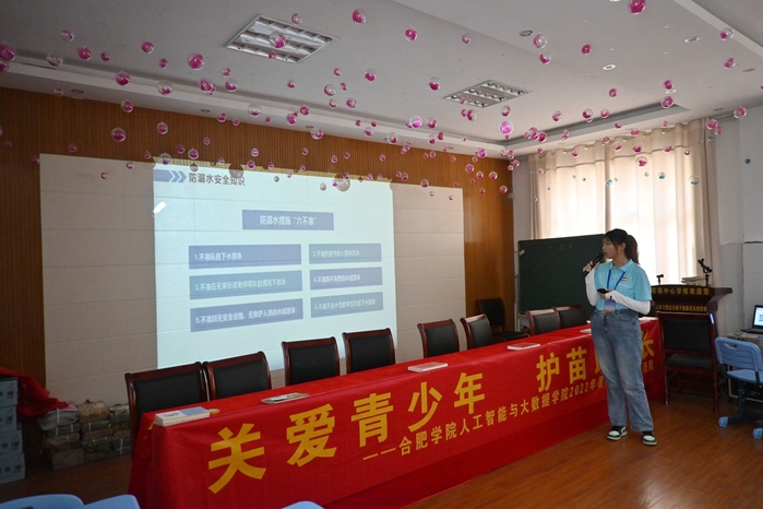 講座上,實踐隊員通過精心制作的PPT、生動有趣的校園情景劇,從防溺水、預防校園欺凌、遠離網癮、防電信網絡詐騙以及注意人身財產飲食交通安全等方面依次開講,并結合大量的數據、實例、圖片等,把安全意識種在了在場的每位小朋友心中。同時,團隊成員還結合合肥學院的基本情況、校園景色等向小朋友們作了大學的宣傳推薦,鼓勵大家努力學習,爭取考上理想的高等院校。