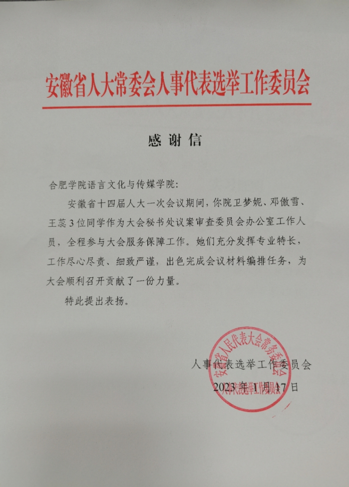 1月11日至17日,我校語言文化與傳媒學院的衛夢妮、鄧傲雪、王蕊三位同學圓滿完成安徽省第十四屆人民代表大會一次會議的實習任務,受到省人大領導的高度評價,并向我校發來感謝信。