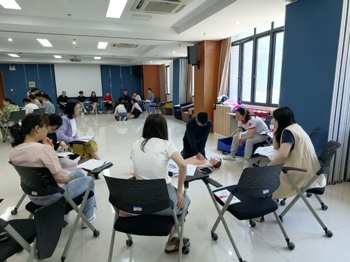 此次培訓采取“線上理論學習+線下實操訓練”的模式進行。現(xiàn)場培訓期間,合肥市紅十字會授課老師圍繞心肺復蘇(CPR)、自動體外除顫儀(AED)使用及創(chuàng)傷包扎等方面,為參訓人員進行專業(yè)講解和手把手教學。大家認真觀摩聆聽,積極主動參與現(xiàn)場演練。