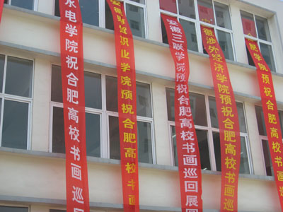 為迎接奧運(yùn),傳承中國書畫藝術(shù),豐富高校校園文化,促進(jìn)校際交流,由我院與合肥工業(yè)大學(xué)、安徽大學(xué)、安徽醫(yī)科大學(xué)、池州學(xué)院等15所高校共同發(fā)起的合肥高校書畫巡回展于5月11日在院黃山路校區(qū)一號(hào)教學(xué)樓大廳隆重舉行。