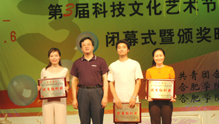 6月14日晚,合肥學院第三屆校園科技文化藝術節、學生社團節閉幕式暨頒獎晚會在院南區禮堂隆重舉行。副院長丁明教授、院團委副書記宣文、生物與環境工程系黨總支副書記居萌、各系團總支書記、學生會負責同學以及800名同學觀看了晚會。