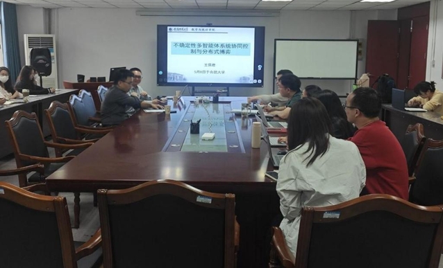 2025年5月8日下午,人工智能與大數據學院邀請安徽師范大學博士生導師王佩君教授在37號樓305會議室為我院師生作學術報告,報告主題為“不確定性多智能體系統協同控制與分布式博弈”,科研處副處長王磊教授、數學與統計系閆曉輝教授、部分青年博士教師及數學學科全體碩士研究生參加此次報告會,本次報告由王磊教授主持。