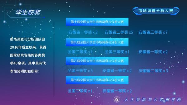 人工智能與大數據學院緊緊圍繞學校人才培養中心工作,2012年以來積極開展以學生科技創新創業為主的第二課堂工作,以學生“能力水平、專業類別和興趣愛好”為根本出發點,目前成立了: RoboCup機器人足球、數學建模、AR/VR團隊、物聯網創新設計、移動應用開發、ACM-ICPC算法設計、仿人機器人、水下機器人、區塊鏈、網絡與信息安全等16支團隊,并且專門建設了機器視覺應用、數學建模與仿真等6個學生創新實驗室、移動APP開發、多智能體系統、數據分析與仿真等8個大學生創客中心;為各團隊提供良好的環境和資源。通過這些工作的開展,人工智能與大數據學院大學生的創新創業能力逐步增強,目前有200余人常駐創新創業實驗室。近五年在師生共同努力下,在各類競賽中共獲獎800項,其中國際級21項,國家級獎項160余項、省級獎項600余項。RoboCup機器人2D仿真足球隊連續5次進入世界杯前8強,先后獲得葡萄牙公開賽冠軍、世界杯季軍等國際獎項,是世界杯、中國機器人足球賽公認強隊;此外獲得中國機器人大賽暨RoboCup公開賽曾獲得國家特等獎1項、美國大學生數學建模競賽獲得國際二等獎6項,全國大學生數學建模競賽獲得國家二等獎1項,CCPC中國大學生程序設計競賽總決賽銀牌,Robocup機器人世界杯中國賽獲得亞軍,“哈工大杯”第十六屆全國機器人錦標賽暨“博思威龍杯”第五屆國際仿人機器人奧林匹克大賽獲得國家一等獎2項,“藍橋杯”全國軟件和信息技術專業人才大賽個人賽曾獲得國家一等獎2項,“田家炳杯”第六屆全國師范院校師范生教學技能競賽國家二等獎、第二屆全國師范生微課設計大賽國家特等獎等。獲批大學生創新創業訓練計劃項目國家級86項,省級168項,獲批大學生創客實驗室項目8項,2名優秀學生獲得安徽省“創新之星”榮譽稱號。