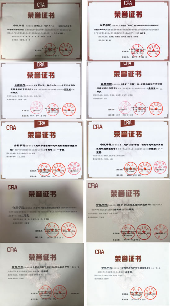 1 | 第九屆全國大學生市場調查與分析大賽 | 張澤,馬玉靜,宋婷,孫悅,孫佳美 | 全國二等獎 安徽省一等獎 |