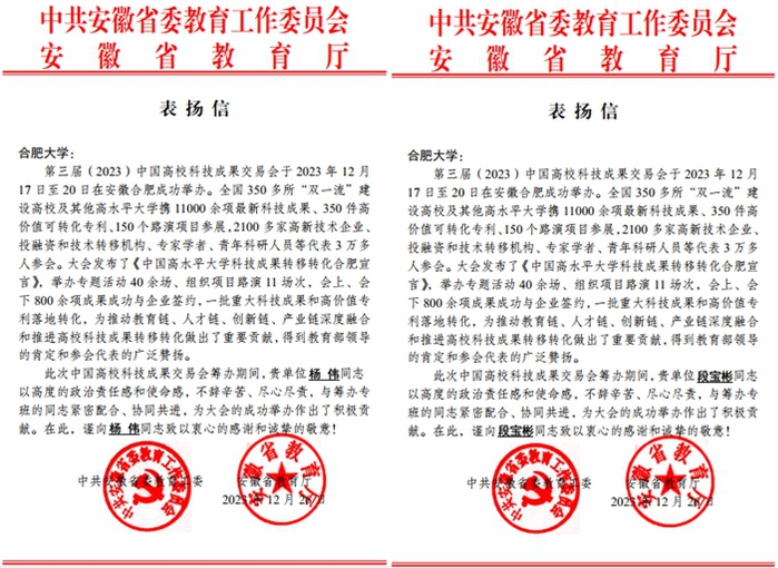 近日,我校收到中共安徽省委教育工作委員會(huì)和安徽省教育廳發(fā)來(lái)的感謝信,對(duì)學(xué)校在第三屆(2023)中國(guó)高校科技成果交易會(huì)籌備工作的貢獻(xiàn)致以衷心的感謝和誠(chéng)摯的敬意。