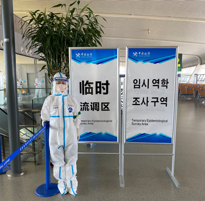 在這個國內疫情嚴控、國外疫情嚴重的時段,張惠琳和她的同事們毫不猶豫地接受了合肥市政府外事辦公室委托,為合肥市空港海關提供語言技術類服務支持。在市海關的指導下,張惠琳反復進行防護服穿戴和現場調度訓練。6月,正值高溫酷暑天氣,張惠琳身著厚重的防護服,衣服總是濕了干,干了又濕,但汗水卻澆不滅她身為黨員教師服務地方的熱情。張惠琳以出色的外語能力和實際行動表達了推動企業復工復產、助力合肥經濟騰飛的決心。