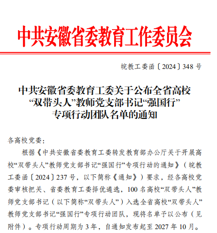 此前,該支部已榮獲全省第二批高校“雙帶頭人”教師黨支部書記工作室、合肥市五星級黨支部、合肥大學五星級黨支部等榮譽。此次入選全省高校“雙帶頭人”教師黨支部書記“強國行”專項行動團隊,是對該支部黨建工作的再次肯定。下一步,支部將以“強國行”專項行動為契機,進一步提升教師黨建工作質量,引導支部師生在服務國家重大戰略和地方經濟社會高質量發展中砥礪新擔當、展現新作為。