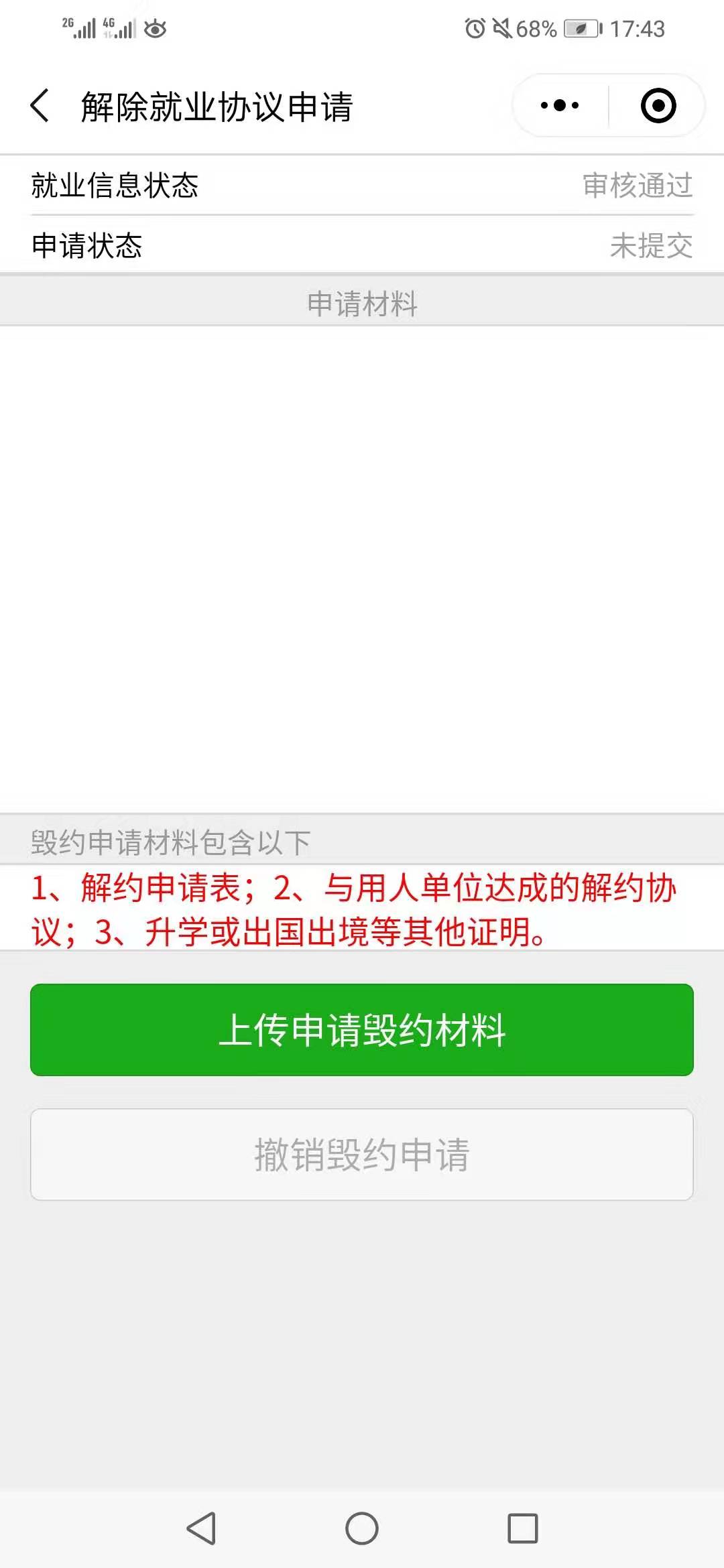 第一步、畢業生進入微信小程序:安徽省大學生就業服務平臺,點擊“派遣”,進入“解除就業協議申請”,上傳解約申請材料。