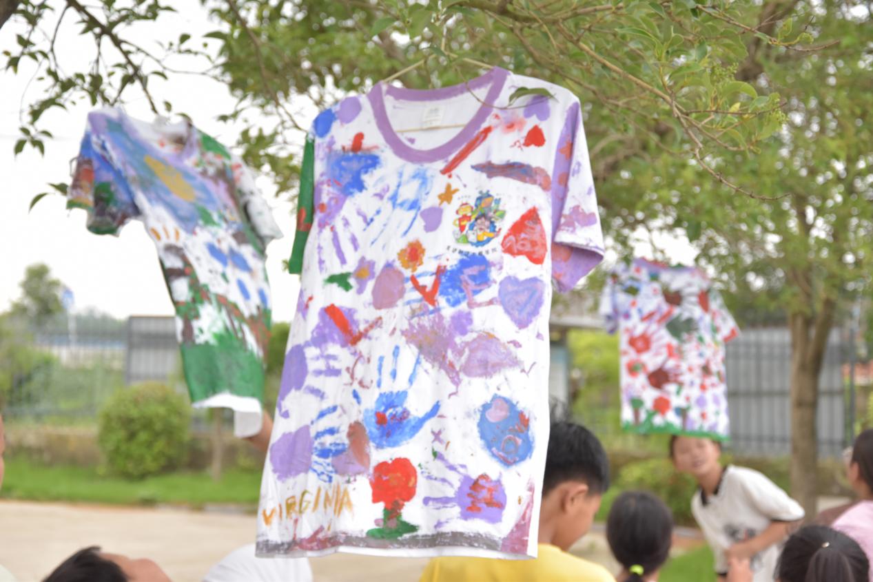 上午八時三十分,調研團隊成員準時開展校園支教。為使孩子們更好地理解與記憶知識,調研成員設計積分獎勵制來調動孩子的自主學習性。此外利用課間時間,帶領孩子們在衣服上涂鴉,并合影記錄這段特殊時光。