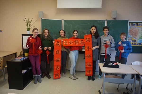 元月二十四日、二十九日和三十一日德國施特拉爾松孔子學(xué)院分別在其開設(shè)中文課程的施特拉爾松德漢薩文理中學(xué),格賴夫斯瓦爾德蒙特蘇里文理中學(xué)以及洪堡文理中學(xué)舉辦了豐富多彩的迎新年、慶春節(jié)文化體驗(yàn)活動(dòng)。為了使學(xué)生們對(duì)中國的春節(jié)有直觀的感性認(rèn)識(shí),孔院老師帶去了新書寫的對(duì)聯(lián)、大紅的“福”字和中國結(jié),并詳細(xì)解釋其各自的文化含義。學(xué)生們對(duì)這些富含文化元素的物品充滿了興趣,紛紛贊嘆其獨(dú)特與神奇。孔院老師們“趁熱打鐵”,教同學(xué)們嘗試寫毛筆字,在古老的漢字藝術(shù)中體味傳統(tǒng)文化的韻味。最后大家一邊品嘗著孔院老師帶來的中國糖果,一邊觀賞傳統(tǒng)動(dòng)畫片《大鬧天宮》,在歡樂的氛圍中結(jié)束了新鮮有趣的、喜迎春節(jié)的文化之旅。