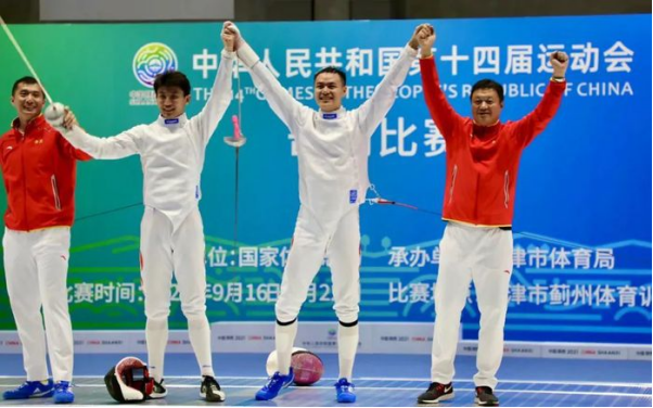 In Tianjin Jizhou Sports Training Center, Lan Minghao, a HFU student majoring in International Trade and Economics, beats his teammate 15-11 to win the Championship of Men’s Epee Individual at the 14th National Games held on the night of September 21.