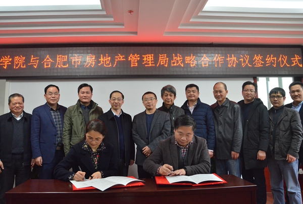 為發揮高校和行業管理部門各自優勢,提高市場監測分析水平,建立完善房地產宏觀調控機制,3月22日,合肥學院與合肥市房地產管理局簽訂戰略合作協議。合肥市房地產局黨組書記、局長許道和,副局長宣圣進,合肥學院黨委委員、紀委書記洪家友,副校長陳秀等參加簽約儀式。合肥學院教務處處長王曉峰、經濟系主任陳江華、合肥學院房地產研究所所長朱德開、合肥學院房地產研究所副所長凌斌等參會。