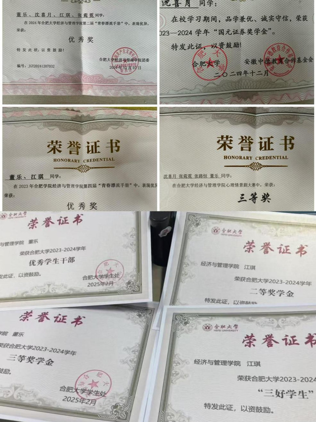 合肥大學香怡社區7棟320宿舍成員共4人,其中,沈喜月擔任班級學習委員,董樂擔任班級組織委員,江琪擔任班級心理委員,張菀霓擔任班級團支書。她們通過制定寢室公約、值班表等方式,全員分工合作,每晚開展打掃活動,保持了宿舍的干凈整潔,曾獲校級“文明寢室”稱號。