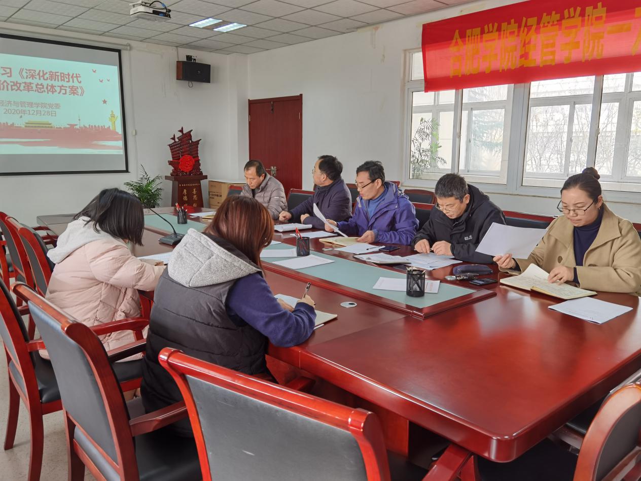 2020年12月28日,經(jīng)濟與管理學院集中學習《深化新時代教育評價改革總體方案》會議于我校一區(qū)博學樓B座二樓會議室順利召開,經(jīng)濟與管理學院黨委書記楊學春、院長陳江華、黨委副書記張永軍、副院長宋玉軍、副院長吳悅及多位黨員教師參加此次學習。