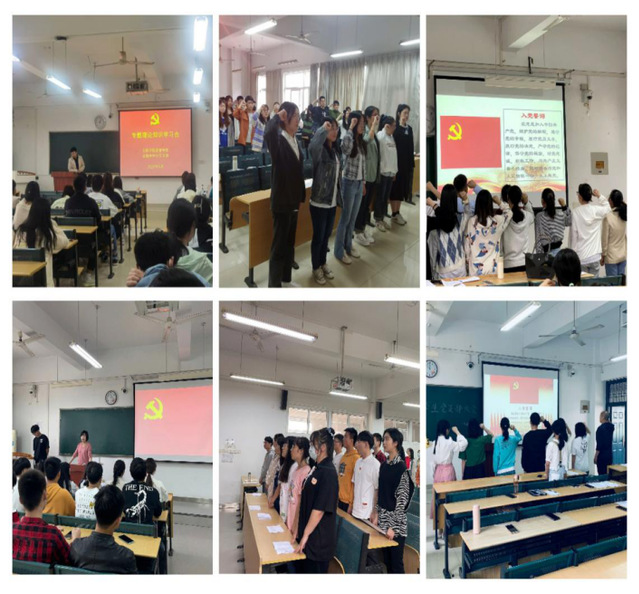 暨全體肅立,奏唱國際歌后,各黨支部書記宣讀了參與宣誓的新發展黨員名單,并帶領新黨員面向黨旗,佩戴黨員徽章, 右手握拳舉過肩頭,莊嚴宣誓。各學生支部書記向新黨員表示祝賀,同時提出嚴格要求。身為黨員,要時刻恪守入黨誓詞,以篤行不怠的內驅力鞭策自己,帶頭發揮黨員的先鋒模范作用,在思想政治、學習成績、學生工作和志愿服務方面敢于爭先,勇做榜樣。同時要不斷鞏固黨史學習教育成果,從一代代中國共產黨人的先進事例中汲取敦篤力行、踔厲分發的前進力量。