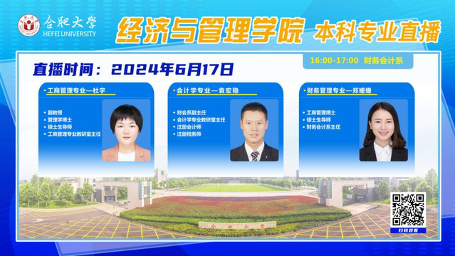 2024年6月17日,合肥大學(xué)經(jīng)濟(jì)與管理學(xué)院各專業(yè)負(fù)責(zé)人走進(jìn)直播間,通過(guò)在線直播的形式,連接學(xué)生與高校,讓未來(lái)的大學(xué)生們?cè)谄聊磺熬湍軌蛏钊肓私馕以旱谋究茖I(yè)設(shè)置、課程內(nèi)容、師資力量、就業(yè)前景及校園生活等方方面面的信息。 本次直播涉及到物流管理系、經(jīng)濟(jì)貿(mào)易系、財(cái)務(wù)會(huì)計(jì)系以及投資金融系共10個(gè)普通本科專業(yè)和1個(gè)物流管理對(duì)外合作專業(yè)。各位專業(yè)負(fù)責(zé)人從專業(yè)培養(yǎng)目標(biāo)、專業(yè)特色以及就業(yè)前景等多個(gè)方面全面介紹了各個(gè)專業(yè)“是什么”、“學(xué)什么”以及“干什么”的問(wèn)題。