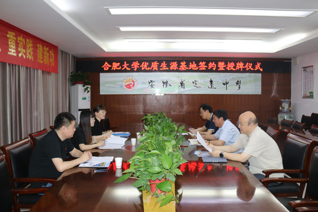 座談會上,于娜從合肥大學辦學特色、學院專業、升學就業等方面對學院進行介紹。定遠中學黨委書記戴茂俊介紹了近幾年學校取得的突出成績。會后,雙方簽署了《合肥大學優質生源基地共建協議書》,并共同為“合肥大學優質生源基地”揭牌。