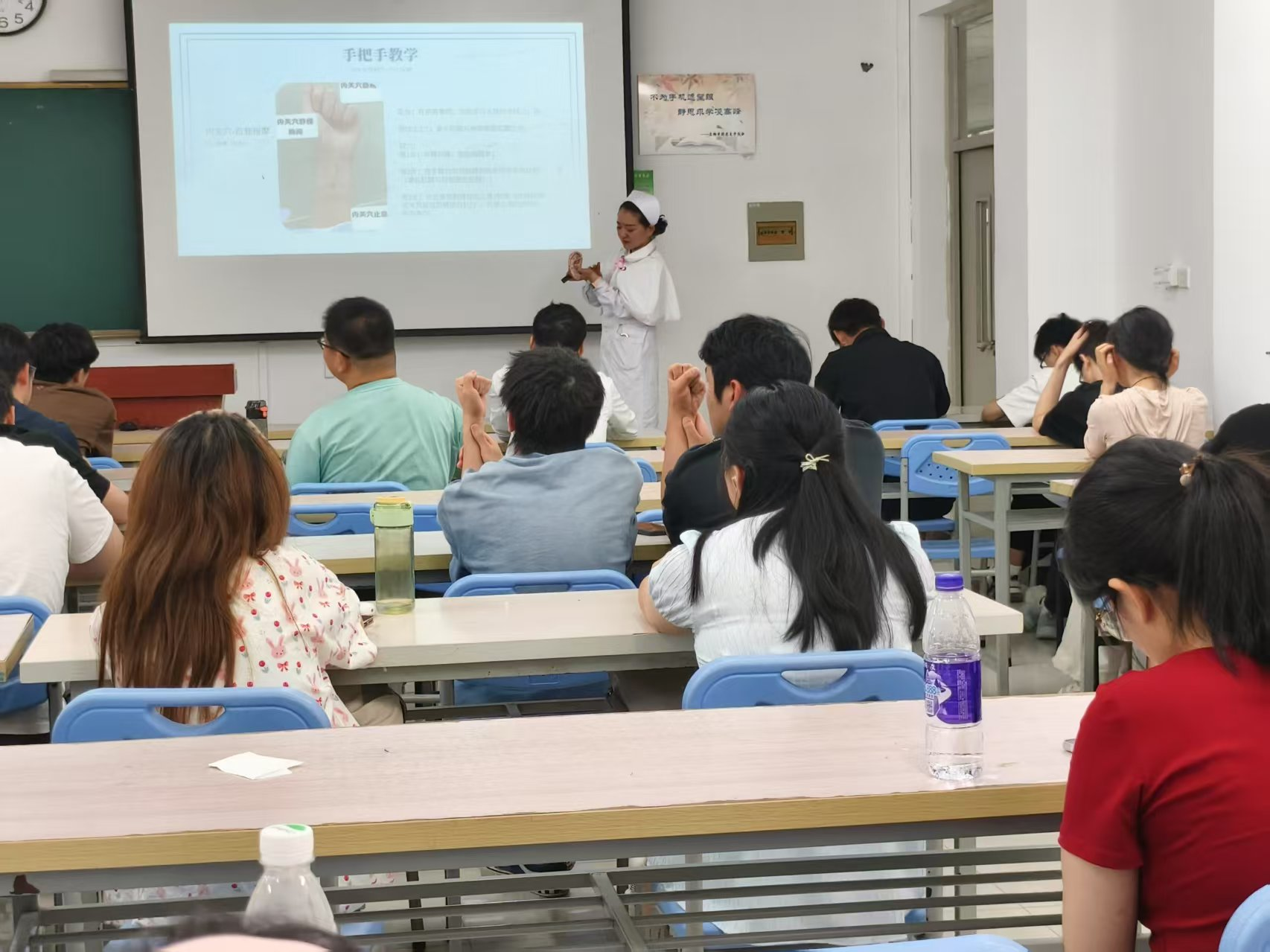 在講解結束后,武老師還為在場的同學們進行了刮痧和耳穴貼壓的實際操作演示。她一邊操作,一邊詳細講解每個步驟的注意事項和技巧,確保同學們能夠掌握這些方法。通過親身體驗,同學們不僅加深了對中醫護理治療的理解,也感受到了其在情緒管理中的顯著效果。