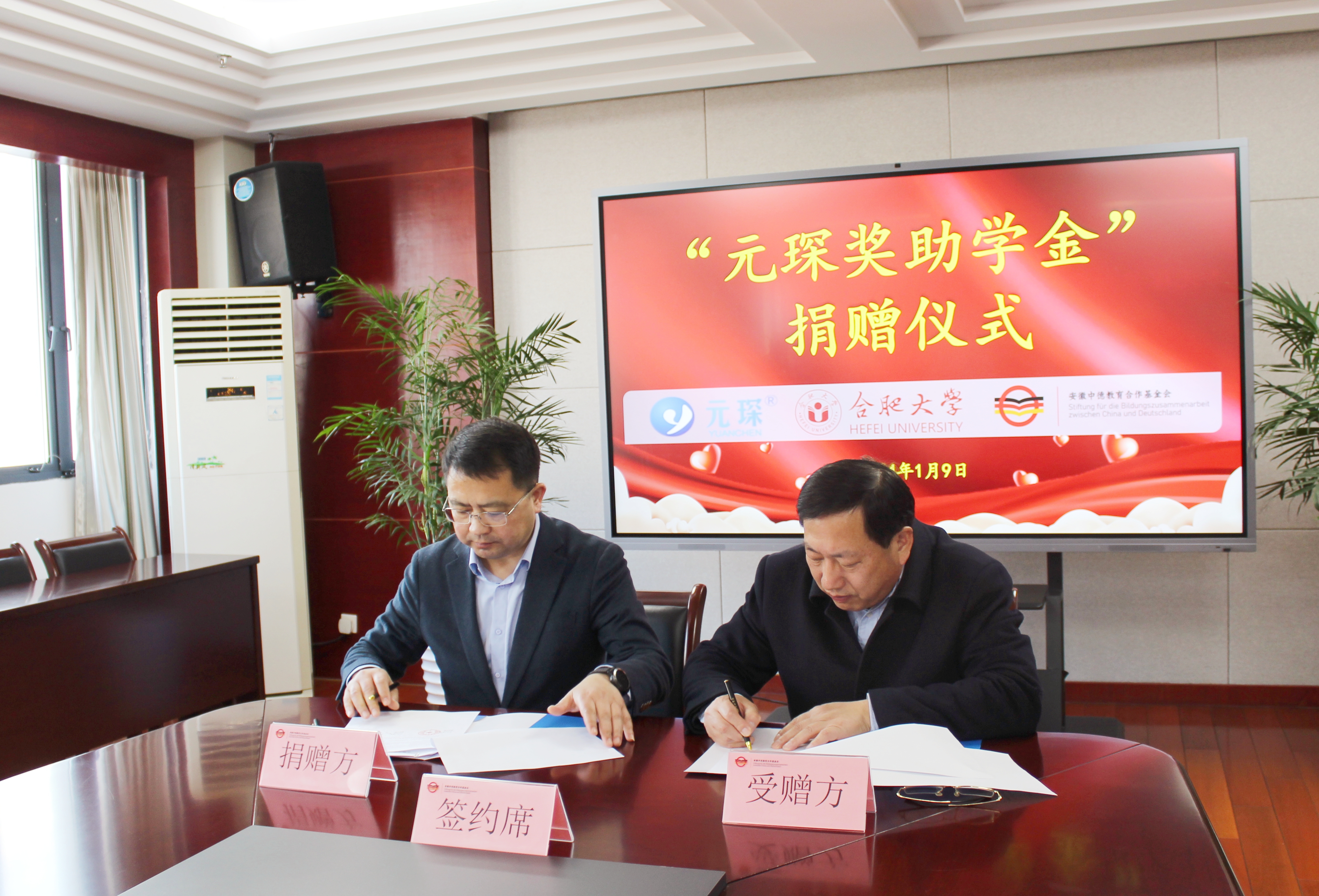 2024年1月9日上午,“元琛獎助學金”捐贈儀式在我校舉行。合肥大學副校長、安徽中德教育合作基金會理事長陳秀在行政樓九樓東會議室熱情接待安徽元琛環保科技股份有限公司執行總裁陳志一行。基金會相關負責同志、能源材料與化工學院領導班子及相關教師等參加了捐贈儀式。儀式由基金會管理辦公室主任劉金平主持。