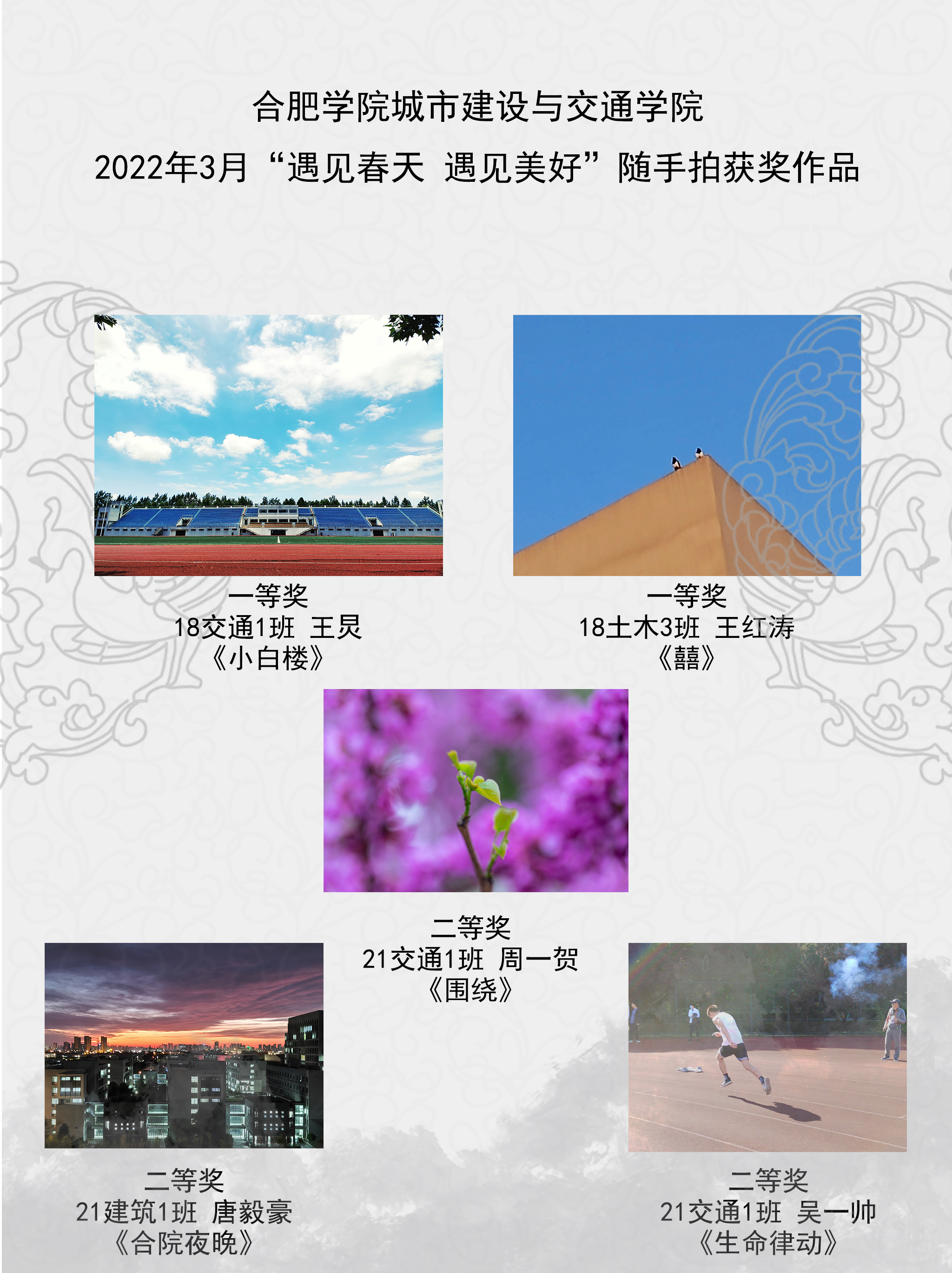 為豐富學生校園生活、發現春天和校園里的美好瞬間,城市建設與交通學院于2022年3月7日—3月25日舉辦“遇見春天 遇見美好”隨手拍活動,共收到來自四個年級的作品120余幅。