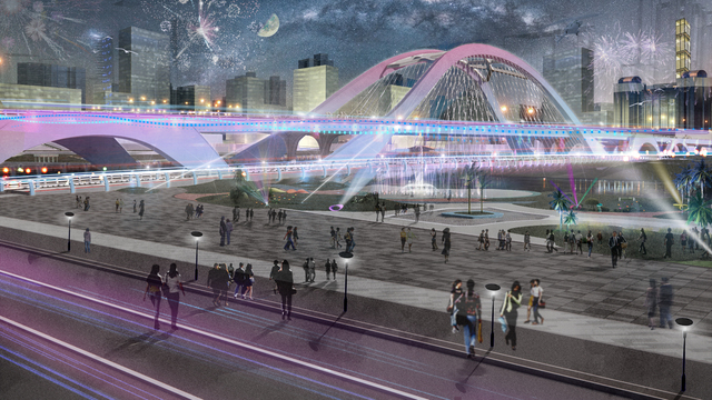 參賽作品“落虹橋”基于在杭州市舉辦的第十九屆亞運會的實際背景,對亞運會主會場附近的錢塘江三橋(西京大橋)及其周圍環境進行優化升級,融入亞運元素,設計出一座屬于杭州市的獨特地標性橋梁。