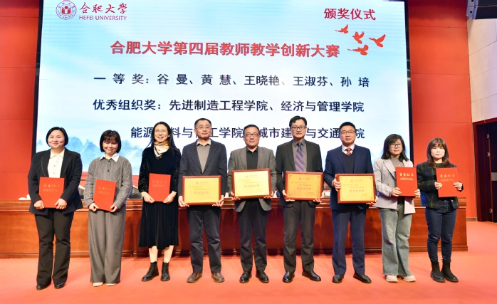 大會還舉行了頒獎儀式。校領(lǐng)導(dǎo)為榮獲“第四屆教師教學(xué)創(chuàng)新大賽、第十四屆青年教師教學(xué)基本功大賽、2024屆本科畢業(yè)設(shè)計(論文)優(yōu)秀指導(dǎo)教師”一等獎獲獎教師和優(yōu)秀組織獎教學(xué)單位頒發(fā)證書并合影留念。