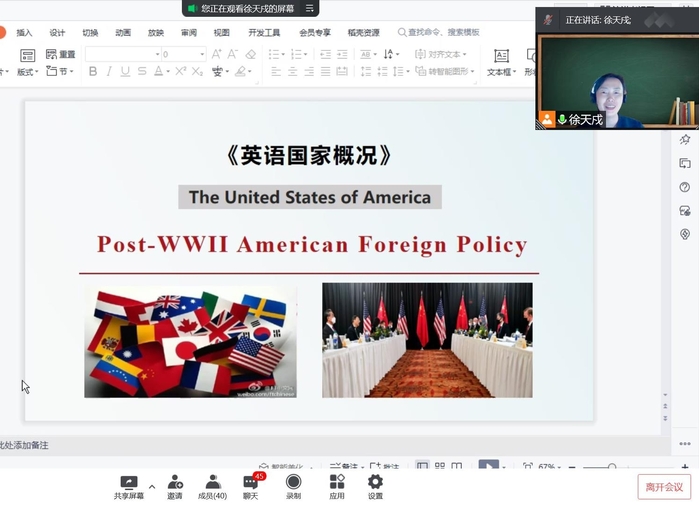雖然已具備較為豐富的線上教學(xué)經(jīng)驗(yàn),但外國語學(xué)院的徐天戍老師還是堅(jiān)持不斷探索更好的教學(xué)方式。徐天戍本學(xué)期教授《英語國家概況2》和《英語聽說2》兩門課程,雖然線上課堂有局限性,但徐老師靈活并用智慧教學(xué)手段,讓課堂“更智慧”。徐天戍每節(jié)課都會讓學(xué)生用學(xué)習(xí)通簽到,通過對比學(xué)習(xí)通簽到名單和會議室在線人數(shù),雙重考勤,及時(shí)了解學(xué)生到課情況,保障到課率;通過不定時(shí)隨機(jī)點(diǎn)名、發(fā)布主題討論等方式,提高學(xué)生專注度;沿用翻轉(zhuǎn)課堂形式,讓學(xué)生完成小組任務(wù)、課前十分鐘測試、課后測試、上傳筆記,確保學(xué)生“真在學(xué)”。