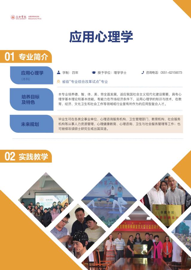 應用心理學(本科) 咨詢電話:0551-62159073 省級“專業綜合改革試點”專業 學 制:四年 授予學位:理學學士 培養目標及特色:本專業培養德智體美勞全面發展,適應我國社會主義現代化建設需要,具有心理學基本理論和基本技能,有能力在市場經濟條件下,運用心理學的知識與技術,在教育、經濟、文化衛生和社會工作等領域或行業里有所作為的應用型復合人才。 畢業生發展方向:畢業生可在各類企事業單位、心理咨詢服務機構、衛生管理部門、教育機構、社會服務機構等從事人力資源管理、心理健康教育、心理咨詢、衛生與社會服務管理等工作;也可繼續攻讀碩士研究生或出國深造。