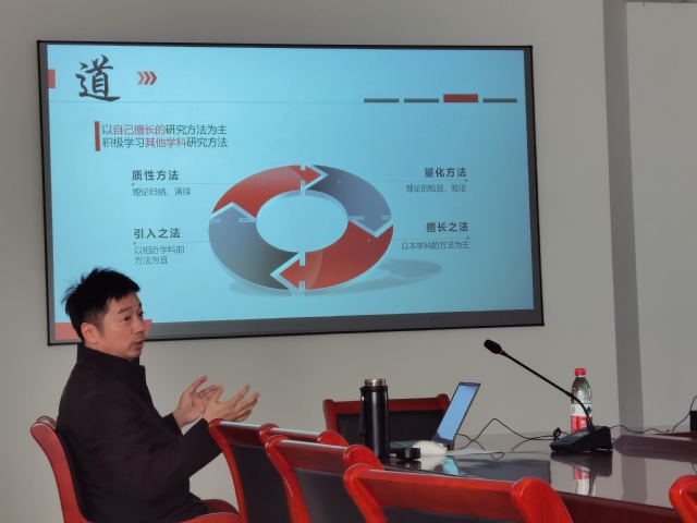 在講座過程中,董尹博士為大家作了題為“實虛結合道術相長——十年感悟與失敗經驗”的專題講座。從“論文是硬通貨”的風趣之詞開始,董尹博士在總結個人十年間多次申報國家自然科學基金和國家社會科學基金的豐富經驗基礎上,圍繞申報準備、選題技巧、寫作方式、對國家基金申報書的各個部分進行了詳細的拆解與分析。在對比國自科與國社科申報流程差異的基礎上,介紹了個人的心得體會。董博士強調,選題要圍繞申報指南進行,在充分結合個人核心研究方向的同時,還應為后續研究留下繼續研究的接口和延展的空間。