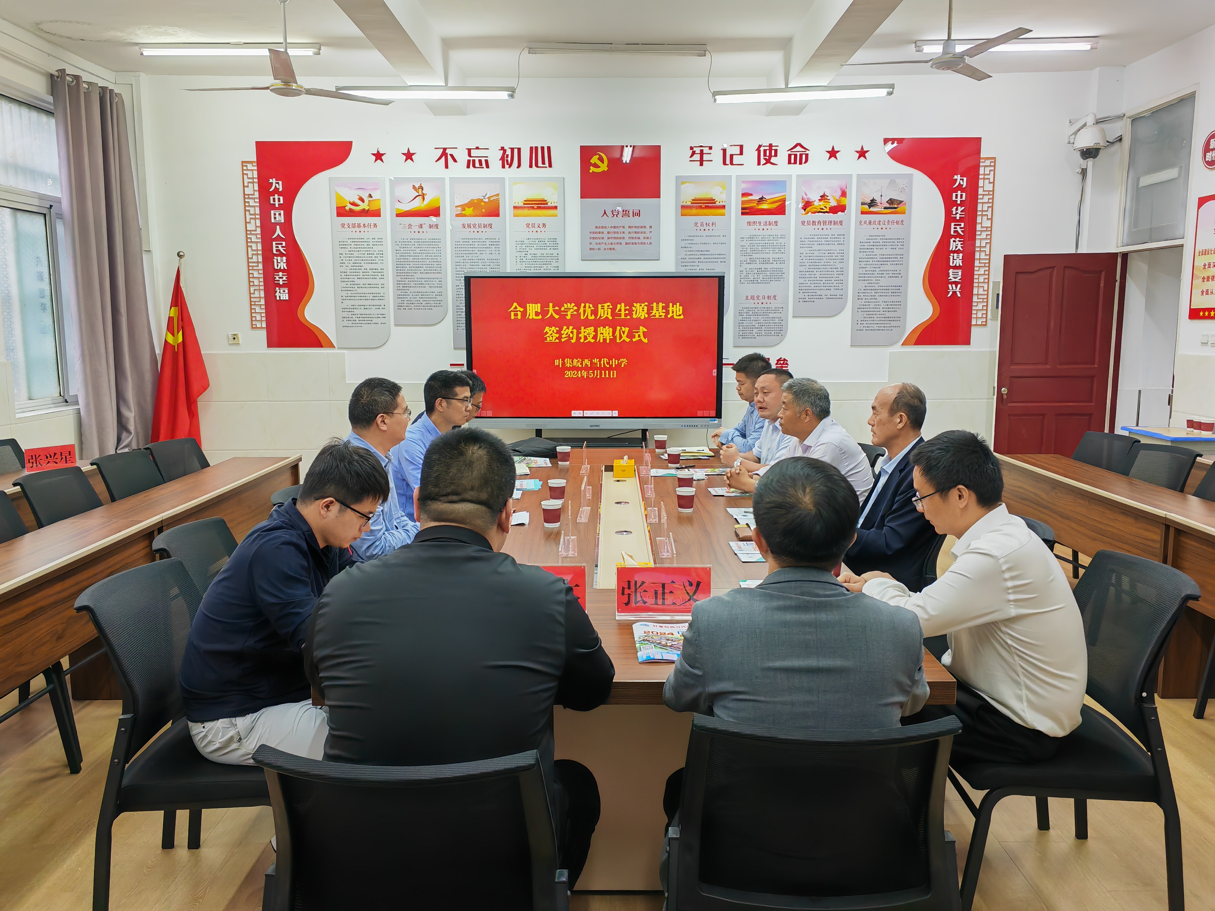在安師大附屬葉集中學,阮班鋒就我院在人才培養、教學科研、科技創新、專業設置等方面的特點與優勢進行了詳細介紹,希望通過共建優質生源基地的方式,進一步加強兩校之間的交流與合作。安師大附屬葉集中學校長章志學表示,合肥大學授予安師大附屬葉集中學“優質生源基地”稱號,不僅是對學校辦學成果和人才培養的充分認可,更為兩校今后深入開展交流與合作奠定了堅實的基礎。座談會后,雙方簽署《合肥大學優質生源基地共建協議書》,并舉行了合肥大學和安師大附屬葉集中學“優質生源基地”授牌儀式。