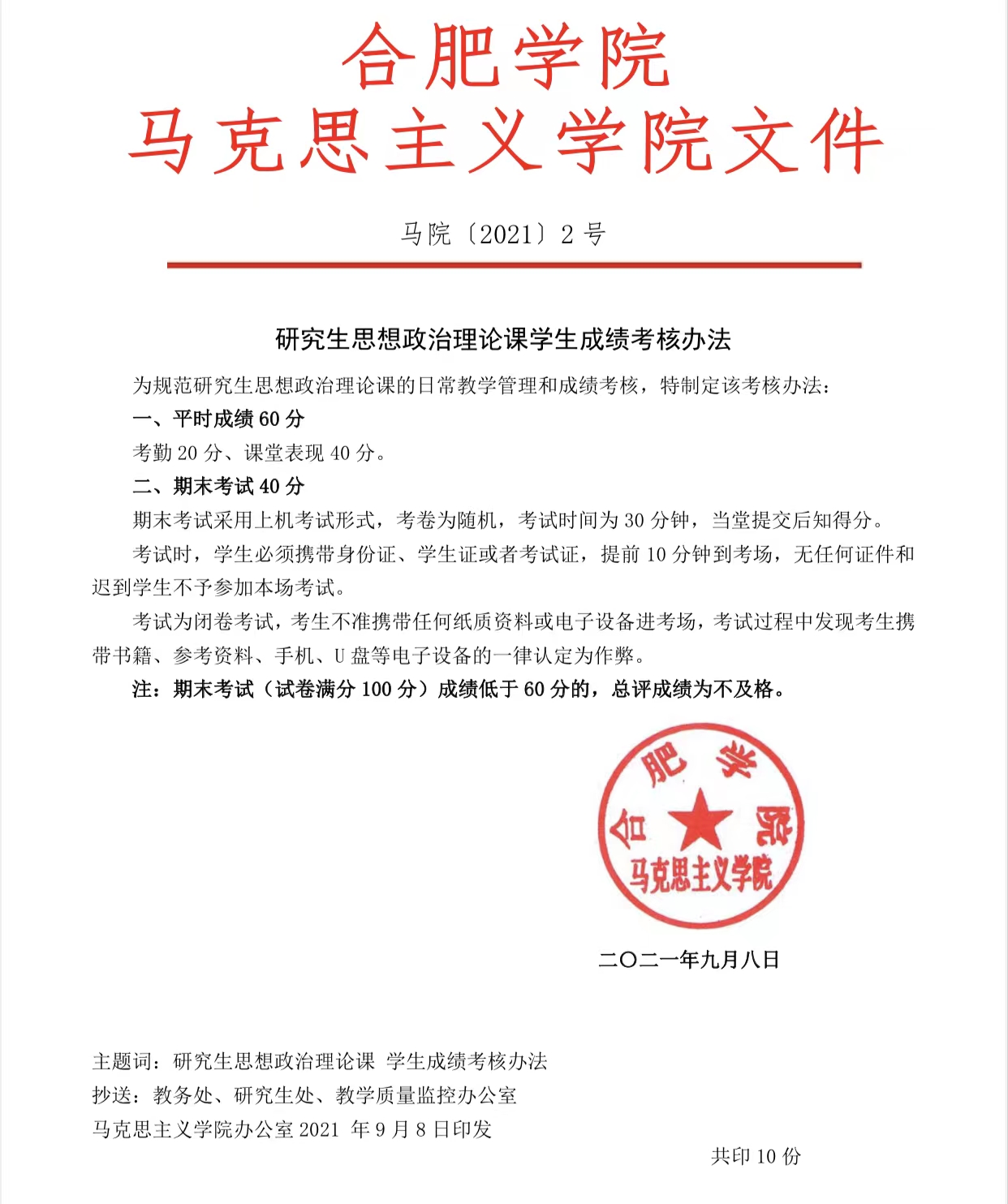 研究生思想政治理論課學生成績考核辦法(馬院〔2021〕2號)