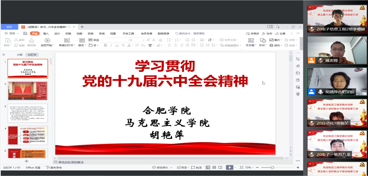 5月1日晚,先進制造工程學院分黨校第五期入黨積極分子通過騰訊會議平臺開展了第三次黨課教學,本次黨課由馬克思主義學院黨委書記、院長胡艷萍教授主講,機制學生黨支部書記威力旺老師主持,先進制造工程學院分黨校第五期入黨積極分子班共124名學員參加了本次課程,本次授課主題是“學習貫徹黨的十九屆六中全會精神”。