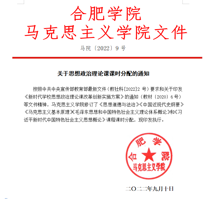 關于思想政治理論課課時分配的通知(馬院〔2022〕9號)