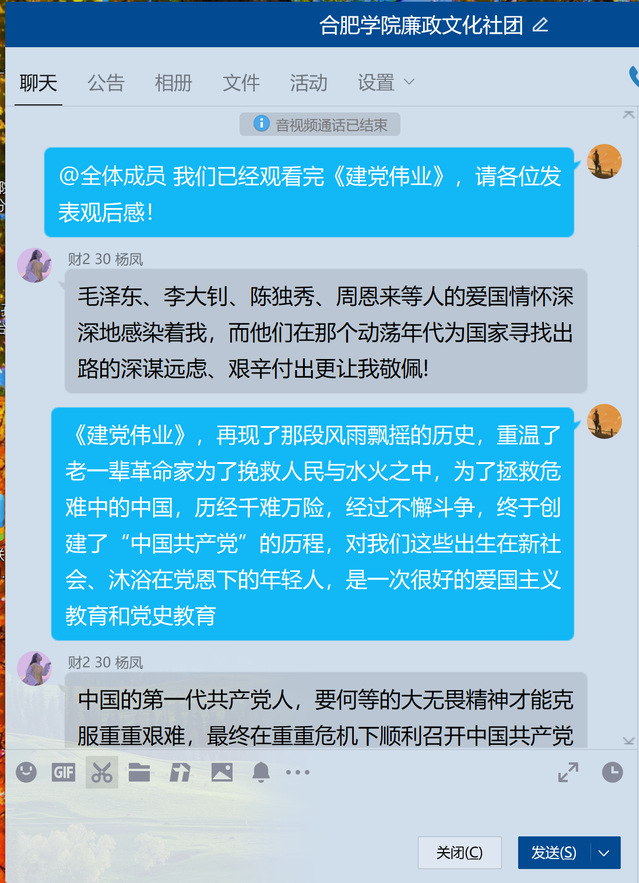 此次團日活動主要以主題會議的形式展開。當天晚上七點,參與活動的同學們早已提前進入QQ群語音。會議伊始,社團團支書李致遠發言,向大家介紹此次團日活動的主要內容和開展的重要性。隨后便是集體觀看電影《建黨偉業》精選片段,通過觀看電影,感受了革命先輩崇高的信仰,進一步加深了社員們對黨的歷史和黨的路線、方針、政策的認識,同時也營造出濃厚的愛國主義教育與氛圍,激發了社員們學習和發揚革命先輩艱苦奮斗、無私奉獻的革命精神。緊接著,團支書帶動大家一起發表觀后感,并討論自己對百年黨史的學習感悟,同學們紛紛被打動,更加踴躍發言。最后,團支書和社長發言,就此次活動做了簡單總結,激勵社團成員對百年黨史進行持續深入學習,不忘初心。