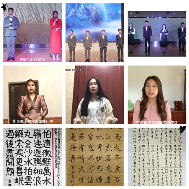本次大賽通過誦讀、講解、書寫等多種方式,傳承中華經典,慶祝建黨百年。在“誦讀中國”經典誦讀大學組比賽中,魯世秀、丁婧指導的,張昊、張佳駱、張瀚程等同學的作品《月光下的中國》獲一等獎,楊夢涵、李賽賽、王學昊等同學的作品《采蒲臺的葦》獲二等獎,王會、毛慧玲、王文龍等同學創作的作品《絲路贊歌》獲三等獎;在“誦讀中國”經典誦讀留學生組比賽中,章衡、周佳俊指導的,INTHASOME PHOUNIVANH(蘇妮)同學的作品《中國力量》獲三等獎,SANAVONG NITA(陳欣)同學的作品《祖國啊,我親愛的祖國》和CHANTHALATH PHAMEE(李敏)同學的作品《讀中國》獲優秀獎。魯世秀、丁婧獲經典讀誦比賽指導教師獎。