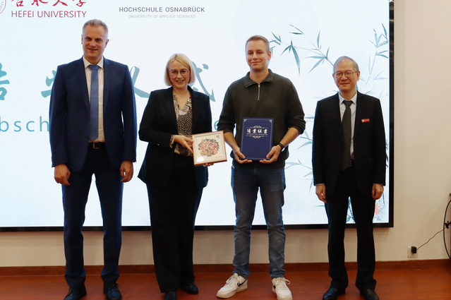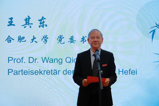 隨后,雙方來到設計學院參加德國學生徽文化秋令營結(jié)業(yè)儀式。儀式在活動回顧短片中開場,短片展示了德國學生在合肥大學交流期間豐富多彩的學習生活,德國學生深度體驗舞龍舞獅、中國功夫、針灸推拿、書法、飲茶等多種不同的中華傳統(tǒng)文化,深刻體現(xiàn)了中華文化的魅力。王其東書記代表學校對卡塔琳娜·普特市長一行表示熱烈的歡迎,對徽文化秋令營的成功舉辦表示祝賀,他表示德國同學在短短一周內(nèi)同中國學生建立起深厚情誼,為日后攜手書寫兩校友誼新篇章打下堅實基礎,此次交流為雙方未來教育、經(jīng)濟、文化發(fā)展注入了生機與活力。奧斯納布呂克應用科學科學大學校長亞歷山大·施梅曼先生在致辭中感嘆中國發(fā)展速度之快,同時也很高興看到合肥大學的高速發(fā)展變化,希望有更多形式的交流活動能夠加深兩校友誼,深化合作與發(fā)展。德國奧斯納布呂克應用科學科學大學的學生代表伊爾薩比·拉德馬赫發(fā)言,她向大家分享了她在合肥大學交流期間新奇的體驗與感悟,并表示會記住這段美好回憶。