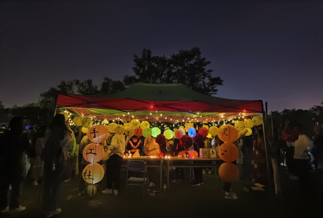 下午五點半,活動伊始,首先呈現在觀眾眼前的是漢宣社的漢服巡游。數十位漢宣社社員提著花燈,著華美飄逸的漢服從三期走到一期,一路上引得眾多學子圍觀。六點,校團委丁婧老師發(fā)表致辭并宣布第十七屆校園文化節(jié)開幕式暨第十三屆花燈節(jié)正式開始。本次活動的主會場在藝術樓后的湖畔。七個主辦社團在此設下營帳。沿著藝術樓的小徑一路上前分別是特色燈區(qū)、心愿區(qū)、燈謎區(qū)、游戲區(qū)以及音樂表白區(qū)。手工社帳篷前排起了長長的隊伍。各位同學在花燈上題字、題詞或寫下自己的愿望。手工社帳篷前也擺放了各具特色的花燈,如蓮花樣式,金魚樣式等,吸引了非常多的同學前來觀賞和拍照,現場人山人海熱鬧非凡。