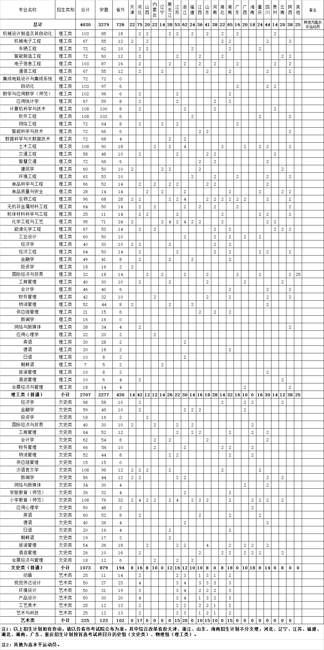 合肥學院2022年本科分省分專業計劃安排表(不含專項計劃、中外合作專業計劃)(安徽省院校報考代碼為9110)