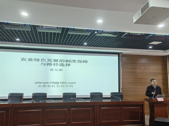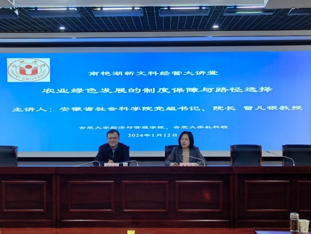 1月12號下午,經濟與管理學院、校社科聯在6號樓學術報告廳共同主辦2024年第一期“南艷湖新文科經管大講堂”。特邀安徽省社會科學院黨組書記、院長曾凡銀教授作題為“農業綠色發展的制度保障與路徑選擇”的學術報告。校長吳春梅教授出席并主持,我校師生100余人到場聆聽學習。