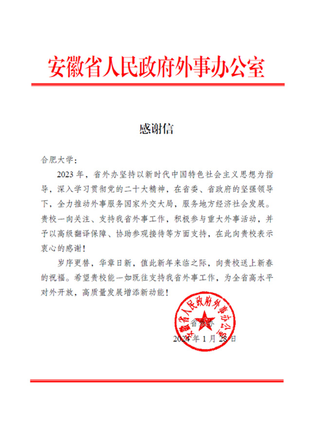 近日,安徽省人民政府外事辦公室、合肥市人民政府外事辦公室分別向合肥大學發來感謝信,充分肯定我校在